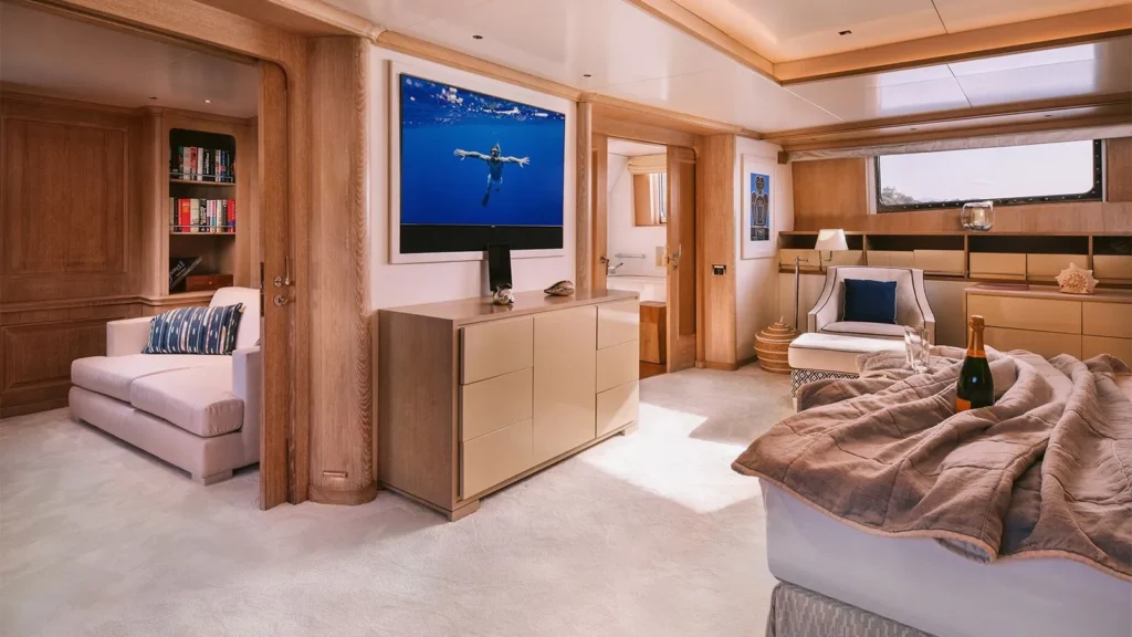 The spacious cabins are havens of tranquility, featuring plush bedding and panoramic windows that frame the mesmerizing seascapes.Â