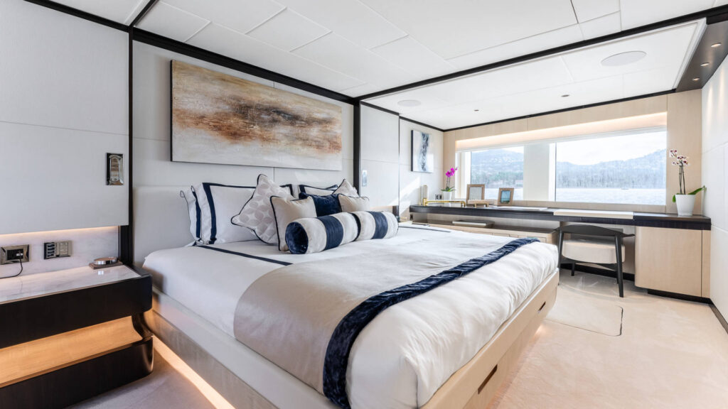 The spacious cabins are havens of tranquility, featuring plush bedding and panoramic windows that frame the mesmerizing seascapes.Â