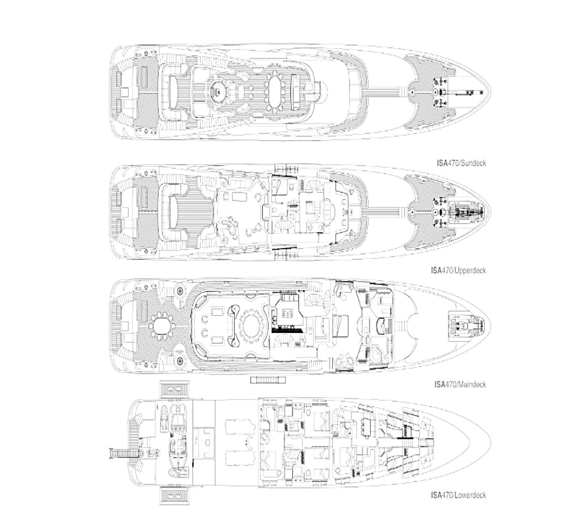 The PENELOPE yacht showcases a meticulously considered layout that seamlessly blends elegance, functionality, and guest comfort. At the heart of the main deck lies a luminous and expansive main salon, flowing effortlessly into a formal dining area—creating an ideal space for both refined entertaining and relaxed gatherings. Large windows line the space, infusing it with natural light and uninterrupted sea views. Ascending to the upper deck, guests are welcomed into the inviting sky lounge, a versatile haven perfect for movie nights, cocktails, or quiet retreats. This area connects to an alfresco dining space aft, offering a graceful transition between indoor comfort and open-air enjoyment. Outdoors, PENELOPE delivers a rich variety of leisure options. The foredeck features a private sun lounge with a jacuzzi and plush sunpads—perfect for secluded relaxation. Aft, the main deck offers elegant seating areas and a well-appointed bar, while the sundeck crowns the yacht with ample space for sunbathing, lounging, and soaking in 360-degree ocean vistas. Crew quarters are intelligently separated from guest areas, ensuring smooth, discreet service throughout every journey. With a layout that balances social energy with serene privacy, PENELOPE offers an onboard experience that is both dynamic and deeply relaxing—crafted for those who appreciate refined design and effortless living at sea.