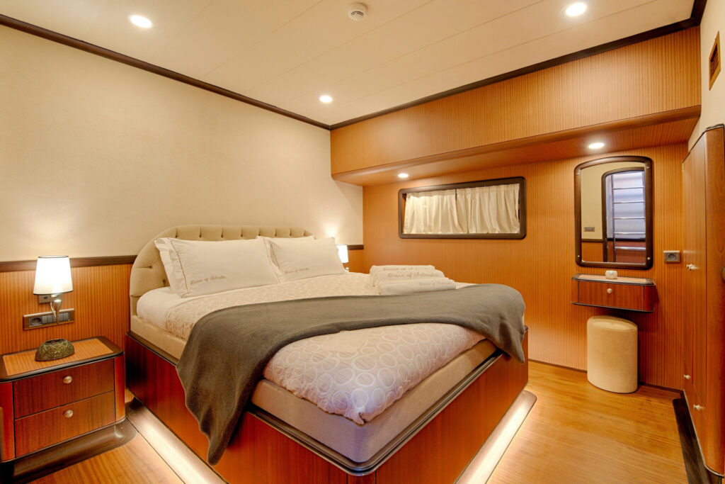 The spacious cabins are havens of tranquility, featuring plush bedding and panoramic windows that frame the mesmerizing seascapes.Â