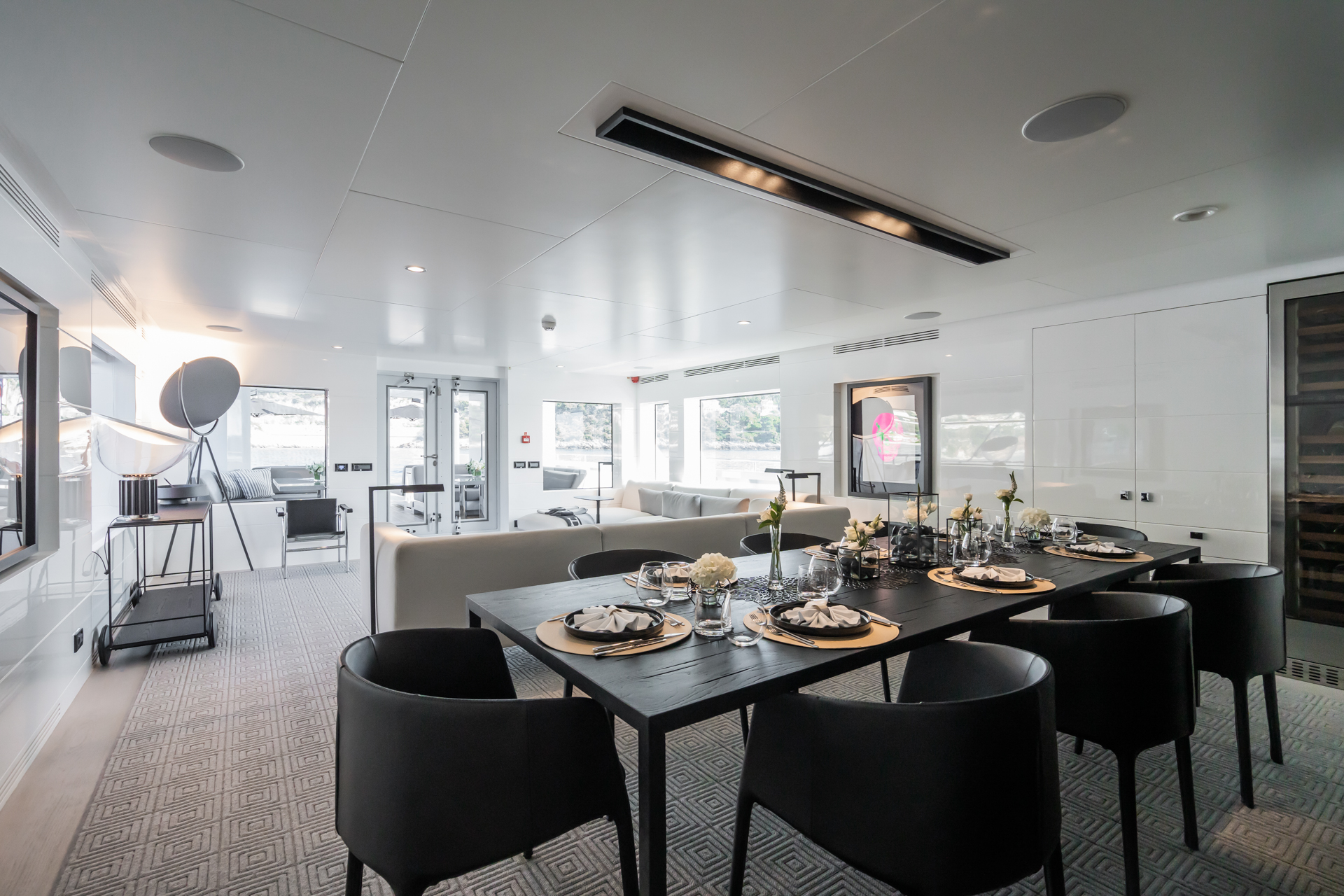 The spacious sundeck features a central bar with panoramic views, a retractable roof, and expansive sun pads for lounging. On the main deck, there are large mirrored tables and shaded seating areas for al fresco dining. Towards the aft, the yacht’s long, open deck—characteristic of the explorer style—offers ample space for guests to use as they wish.