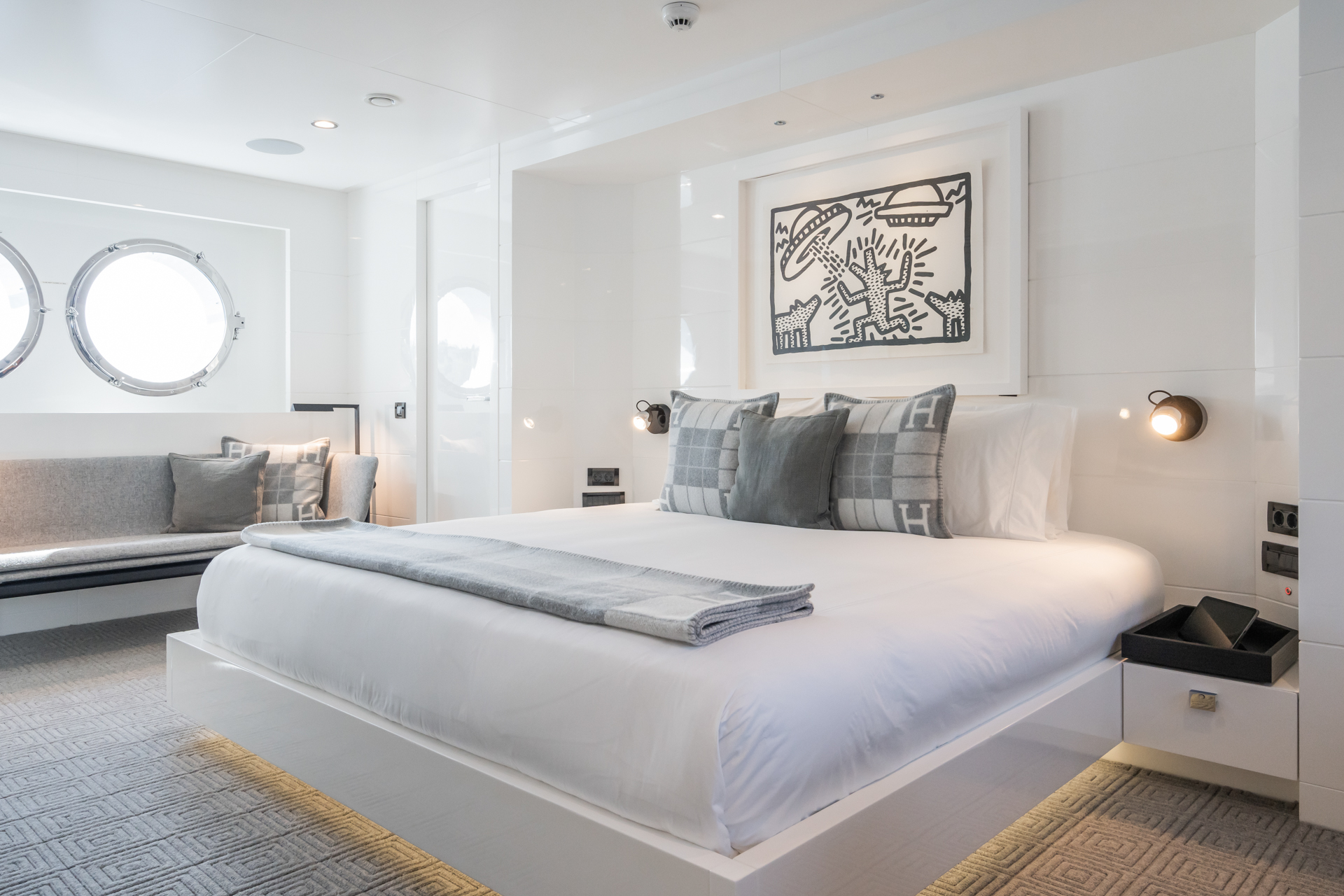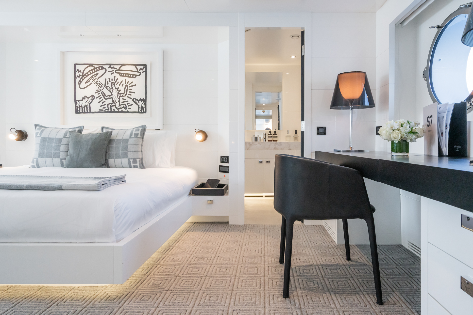 Inside, S7 continues to deliver on comfort and simplicity. The main saloon is bright and airy, with expansive windows offering breathtaking views. It includes a full dining table and a wine fridge at the forward end, perfect for entertaining. The yacht accommodates up to 12 guests in five en-suite cabins, all designed with the same clean, minimalist style as the saloon. The layout includes three double cabins and two twin cabins, each with additional pullman beds. The full-beam master suite is a highlight, featuring an office space and separate his-and-hers bathrooms with a central rain shower.