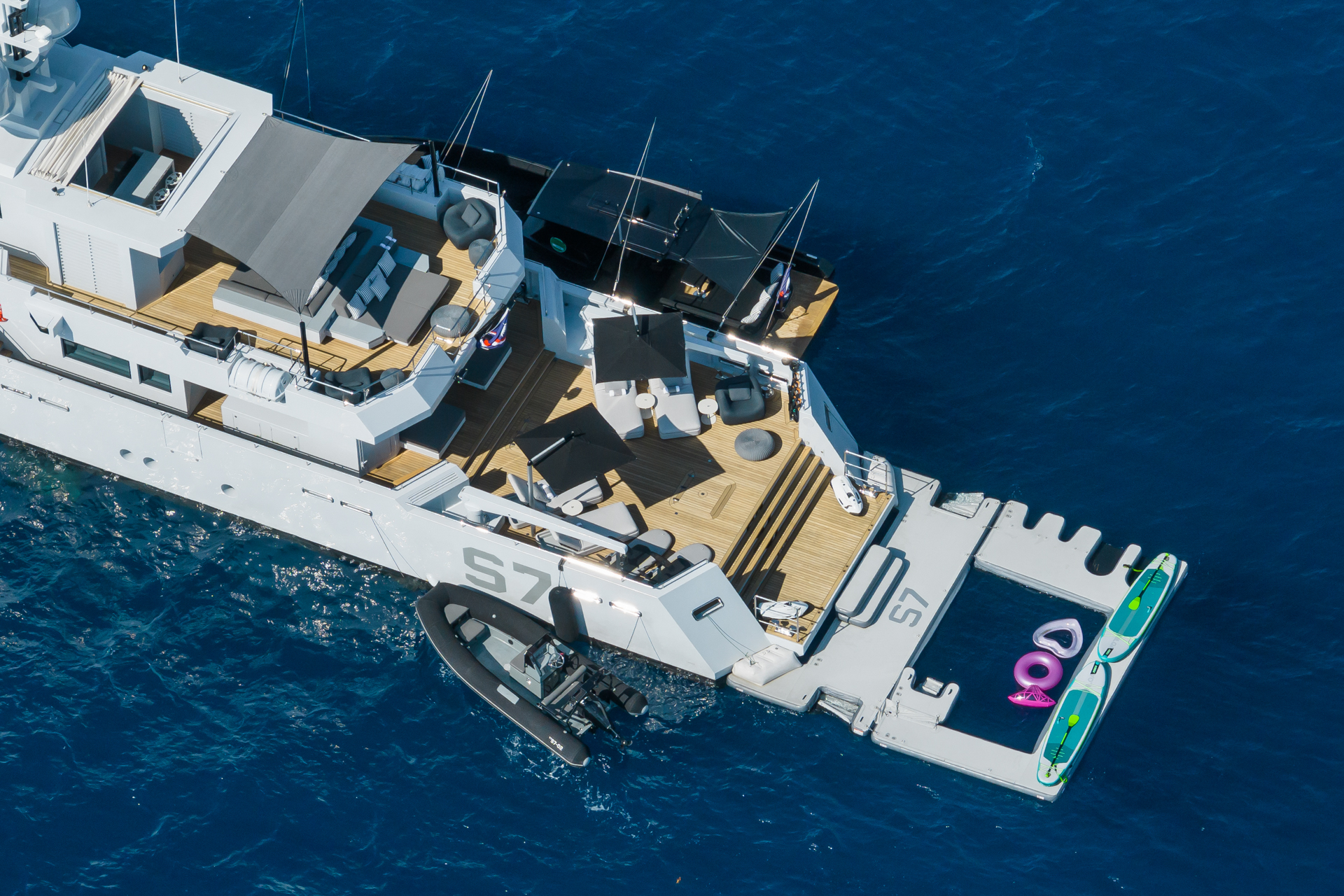 The outdoor spaces truly set S7 apart. With its striking design, the yacht boasts an elongated aft deck, ideal for soaking up the sun, launching water toys, or keeping active. Onboard, you’ll find an action-packed toys list include two of each; Sea-Doo Spark Trixx Jet skis, Fliteboards and FSR Seabobs. S7 also comes with an array of top-quality kitesurfing equipment and a qualified kitesurfing instructor ready to help you develop your skills, whether you’re a complete beginner or looking to advance. For those seeking variety, S7 caters to every pace. Whether you’re chasing thrills, floating in the netted pool, or unwinding in one of the many shaded areas, there’s something for everyone.