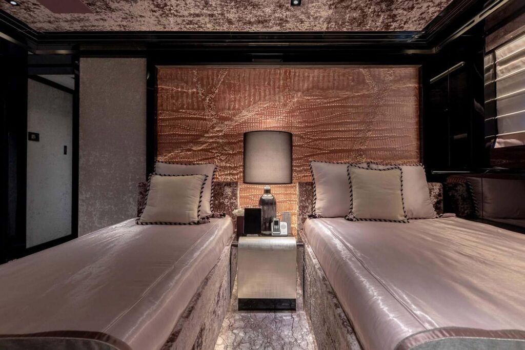 The spacious cabins are havens of tranquility, featuring plush bedding and panoramic windows that frame the mesmerizing seascapes.Â