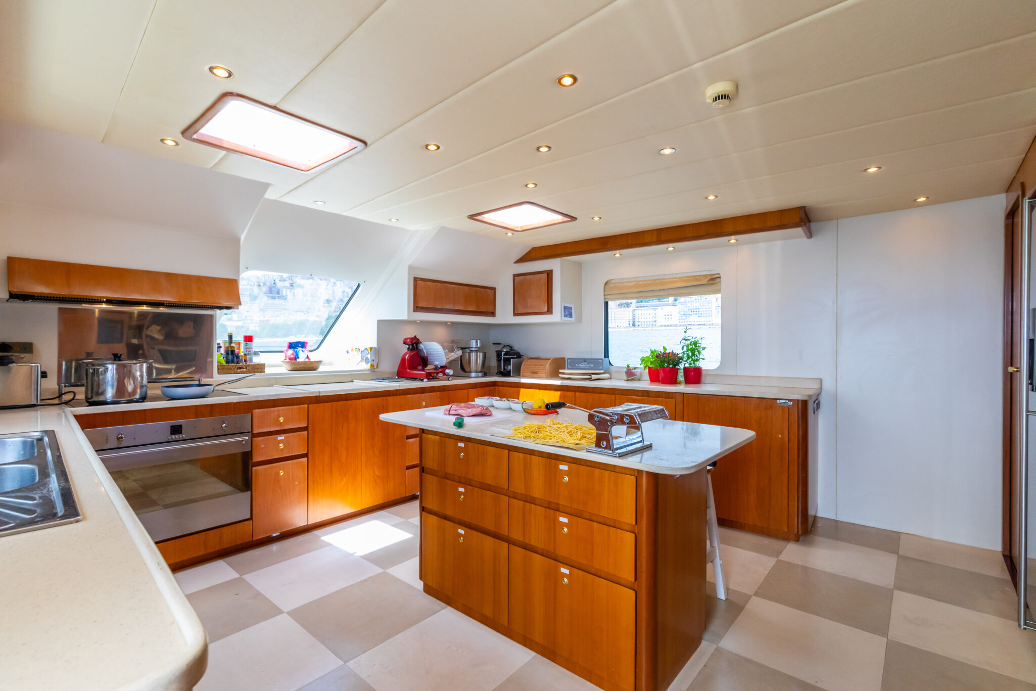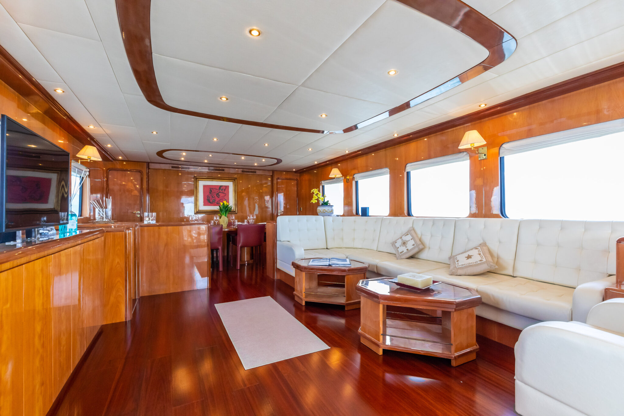 Inside, the main salon serves as a warm and welcoming retreat, complete with Wi-Fi connectivity, air conditioning, and large windows that flood the space with natural light and serene views. Polished wood finishes, neutral tones, and elegant soft furnishings create a setting that is both timeless and effortlessly cozy—ideal for socializing, dining, or simply unwinding after a day at sea.