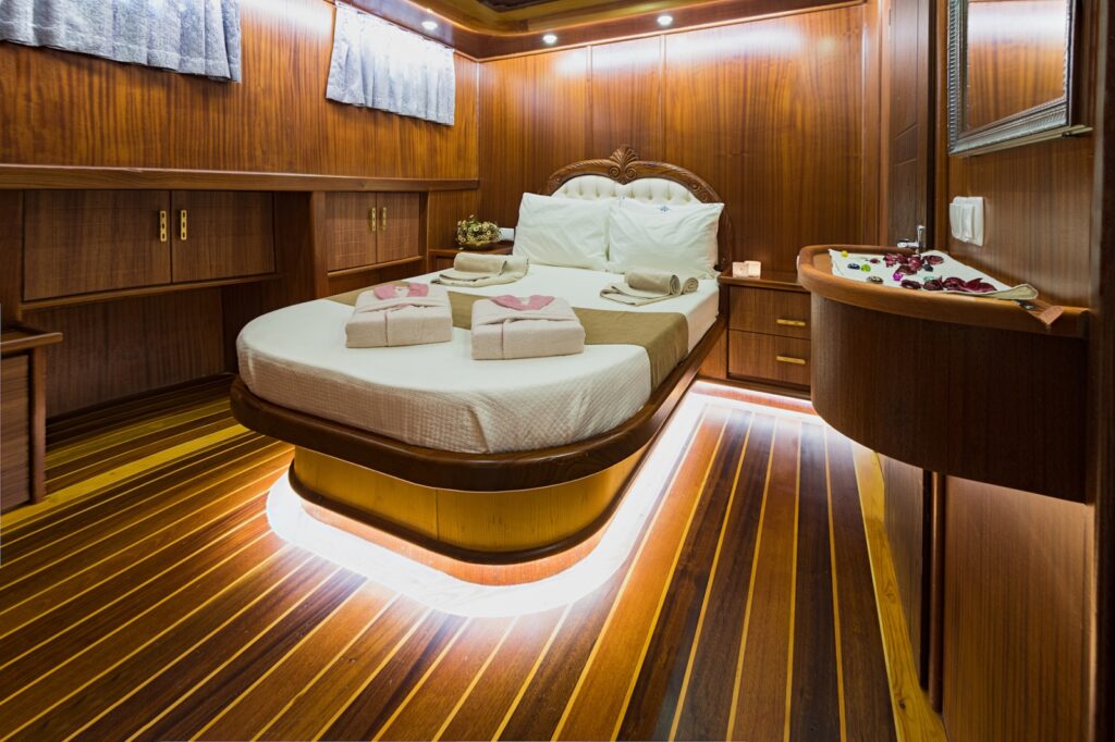 The spacious cabins are havens of tranquility, featuring plush bedding and panoramic windows that frame the mesmerizing seascapes.Â