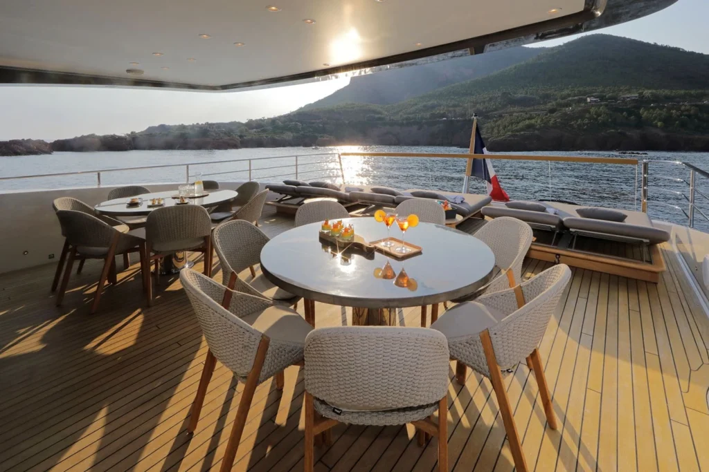 The main deck aft is a true highlight of X’s exterior, featuring unmatched deck spaces that can accommodate large tenders and toys. Adding to the allure is an oversized Jacuzzi pool and an alfresco dining area, creating the perfect setting for guests to savor delicious meals while basking in the Mediterranean ambiance. The swim platform, ingeniously designed to convert into a private beach club, provides direct access to the crystal-clear waters, inviting guests to immerse themselves in the sea’s embrace.