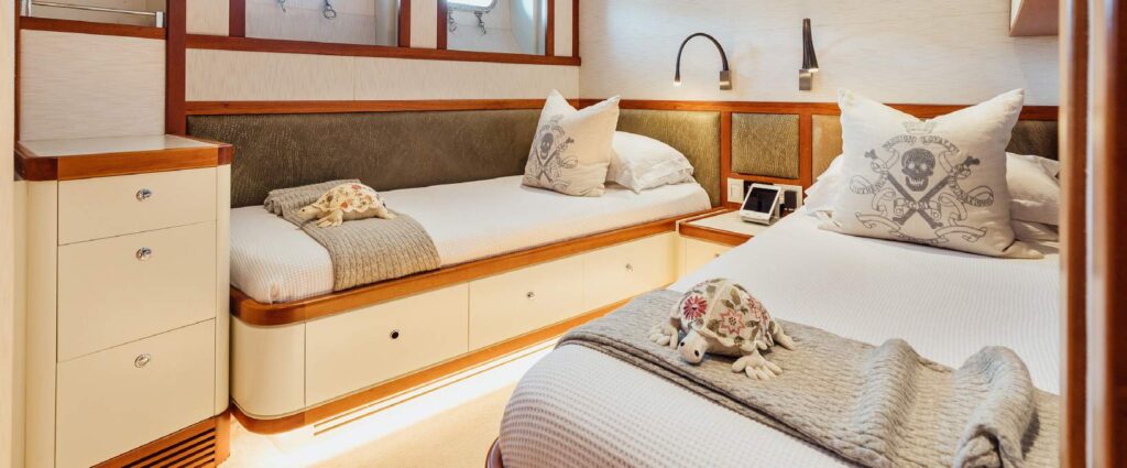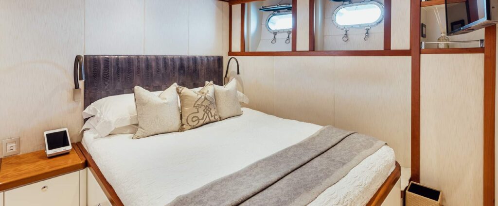 The spacious cabins are havens of tranquility, featuring plush bedding and panoramic windows that frame the mesmerizing seascapes.