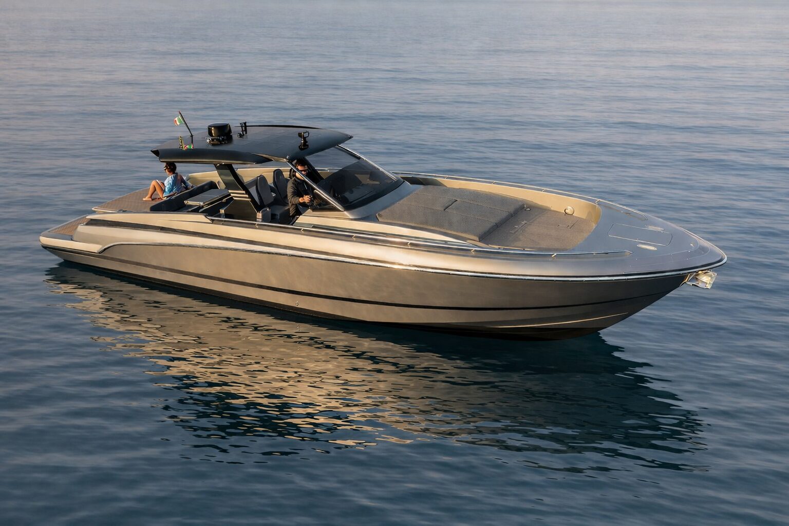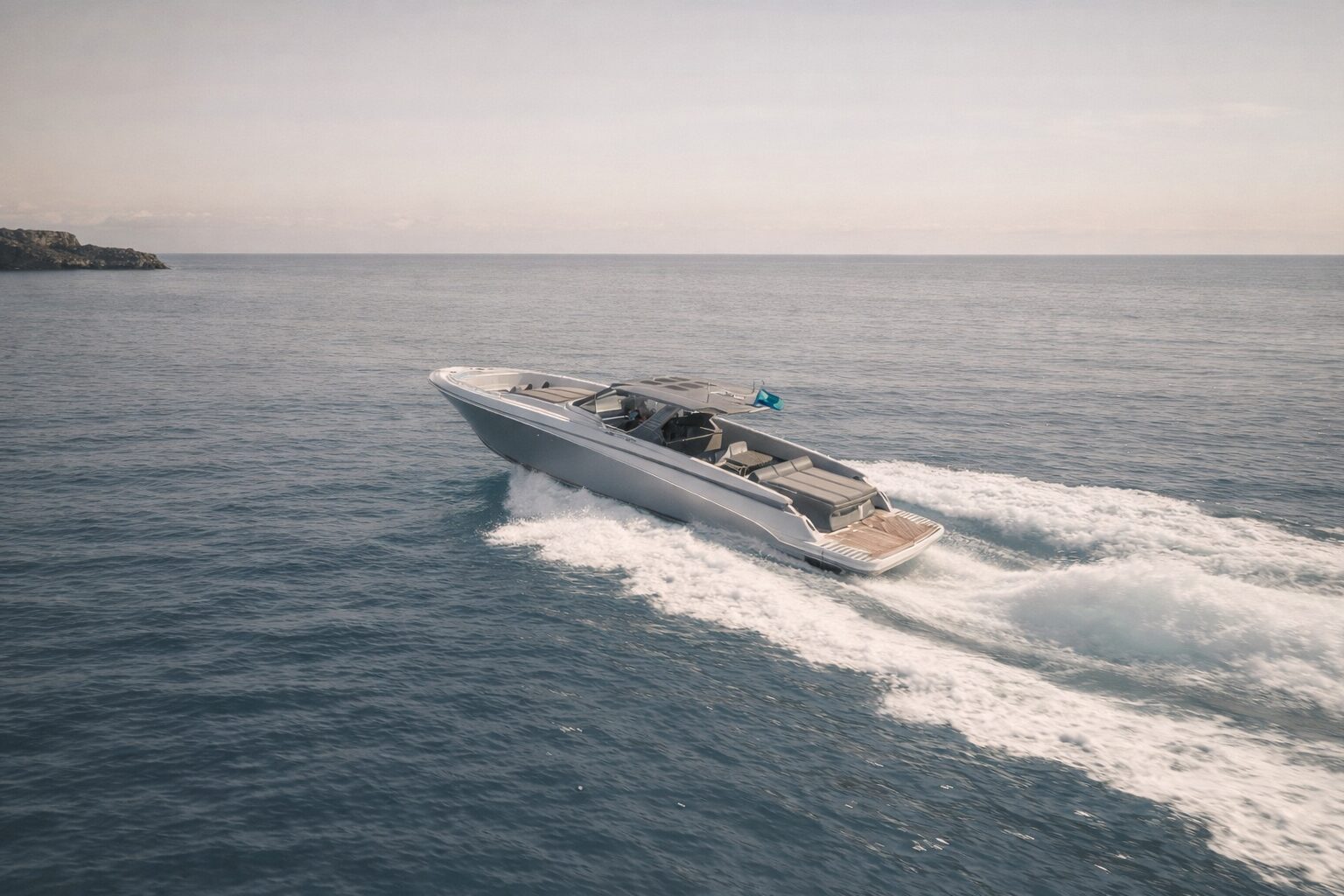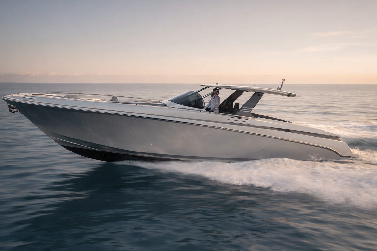 At the helm, the experience becomes more purposeful. The driving position is protected by a laminated glass windshield that provides clear visibility while sheltering guests and captain from the elements. Every detail is arranged with precision, allowing the yacht to deliver both control and confidence at speed.