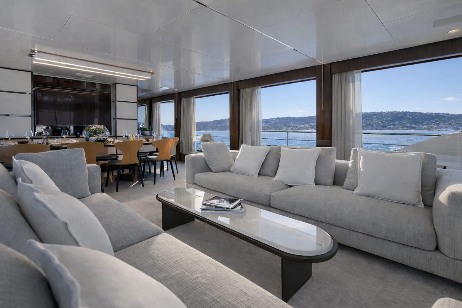 Inside, the yacht showcases a contemporary interior designed by Michela Reverberi, with large floor-to-ceiling windows that maximise natural light and create a seamless connection between interior and exterior spaces. The layout is designed to feel open and refined, with high-quality materials and finishes throughout.