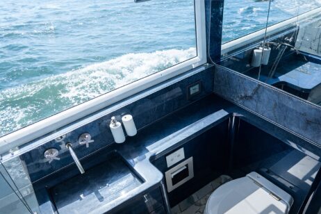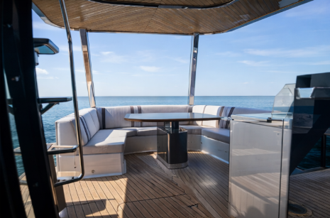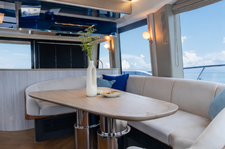 One of her most distinctive features is the signature “beach mode,” where fold-out balconies extend the beam and transform the main deck into an expansive, open-air environment—perfect for entertaining or relaxing at anchor. The salon is flooded with natural light thanks to panoramic windows, while the aft galley and cockpit flow effortlessly together to create a sociable and contemporary atmosphere.