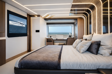 The yacht accommodates up to 10 guests across four well-appointed cabins, including a full-beam master suite, a VIP cabin, and two twin guest cabins. The interiors are finished with high-quality materials and contemporary detailing, creating a sophisticated yet comfortable atmosphere throughout.