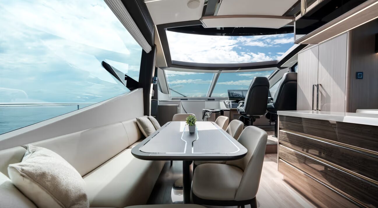 Outdoor living is central to the Galeon 800 Fly experience. The spacious flybridge offers multiple lounge areas, a bar, and optional dining space, making it ideal for entertaining. Additional sunbathing and relaxation areas can be found on both the foredeck and aft deck, ensuring guests can enjoy every moment on board.