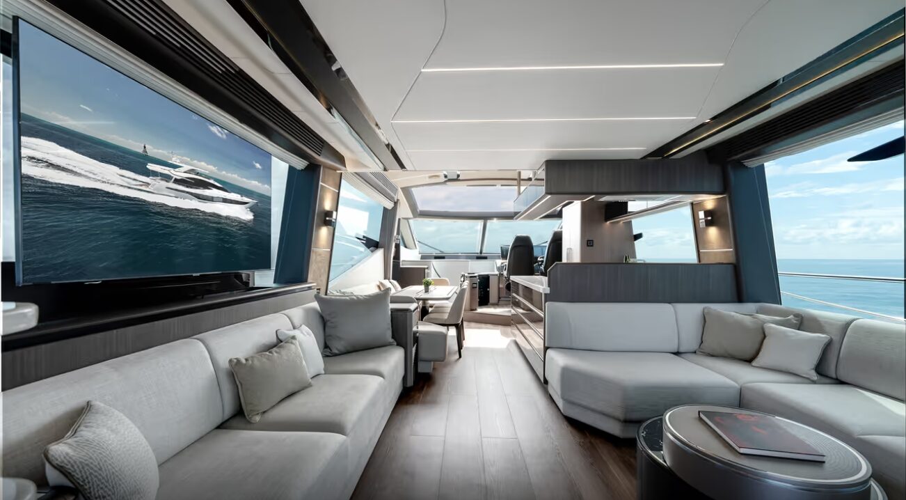 One of the defining features of the Galeon 800 Fly is its signature “beach mode,” with fold-out balconies that significantly expand the main deck, creating an open and immersive connection with the sea. Large panoramic windows flood the interior with natural light, enhancing the sense of space and providing uninterrupted views from the main salon.