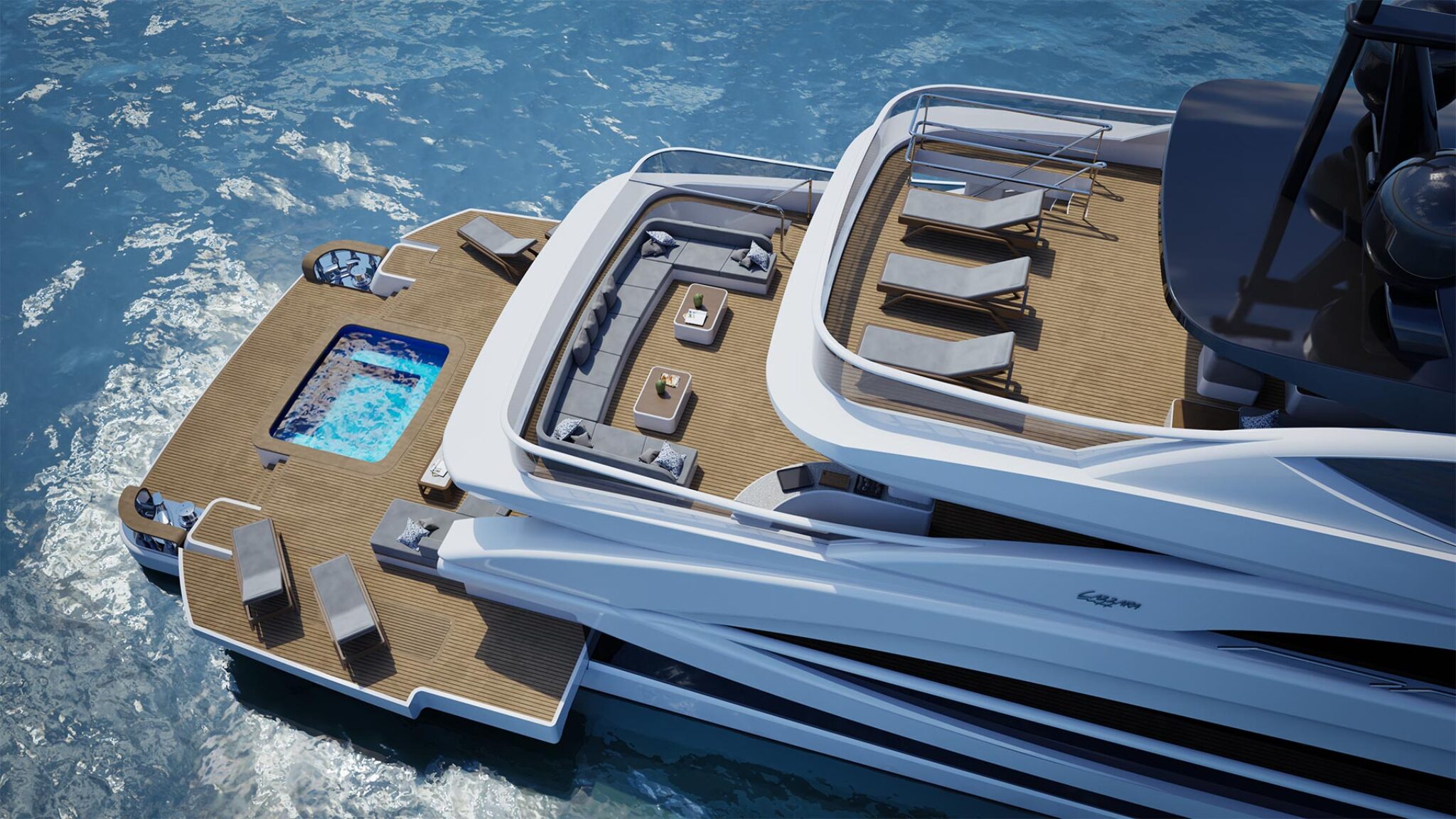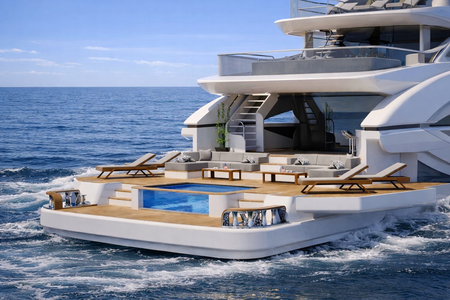 A defining feature of the LMY 165 is its expansive beach club, enhanced by fold-down terraces that significantly increase usable deck space at water level. This area is centred around a large swimming pool, creating a seamless environment for relaxation, entertainment, and direct access to the sea. Extensive use of structural glass throughout the yacht further enhances natural light and strengthens the indoor-outdoor connection.