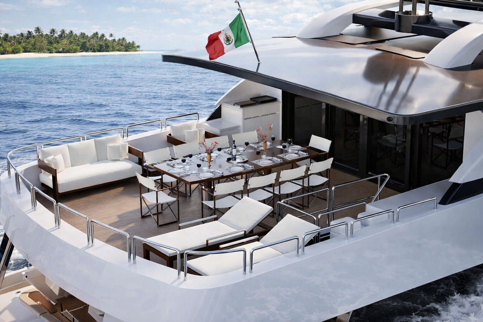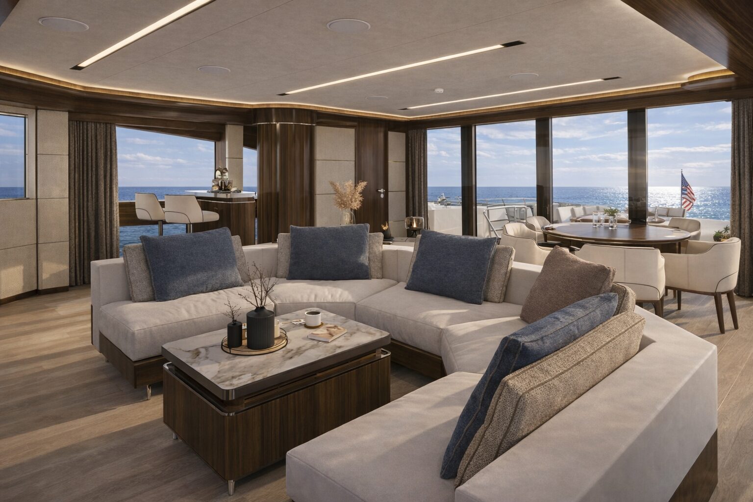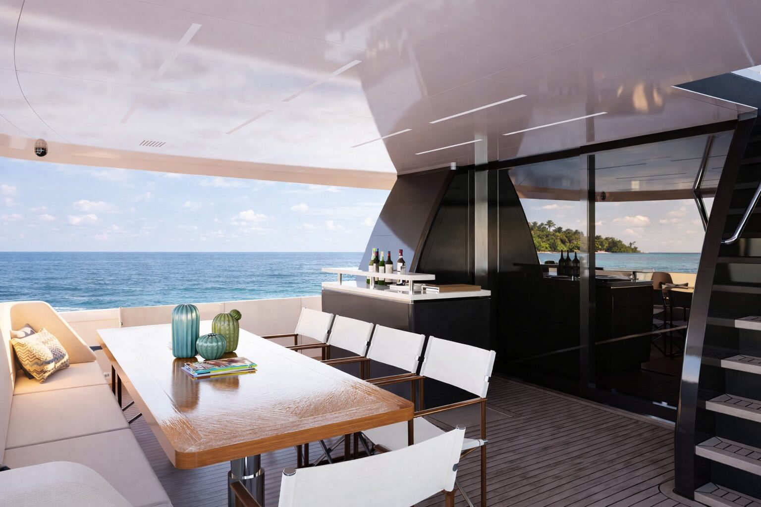 Outdoor areas are designed to complement the yacht’s generous interior volume. The aft deck provides a spacious setting for dining and relaxation, while the flybridge and upper decks offer additional lounge areas ideal for entertaining. A large swim platform and beach club ensure direct access to the water, enhancing the onboard lifestyle and making the yacht well suited for extended cruising.