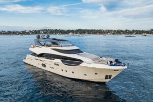 One of the most notable models in the fleet is the Monte Carlo Yachts 96, which measures 29.2 metres in length and is powered by twin MTU 16V 2000 M86 engines, allowing for a top speed of 27 knots and a comfortable cruising speed of 22 knots. The hull, designed by naval architect Carlo Nuvolari in collaboration with Dan Lenard, delivers excellent seakeeping, stability, and fuel economy. The yacht has a generous fuel capacity of 10,500 litres, providing extended cruising range for long-distance passages.