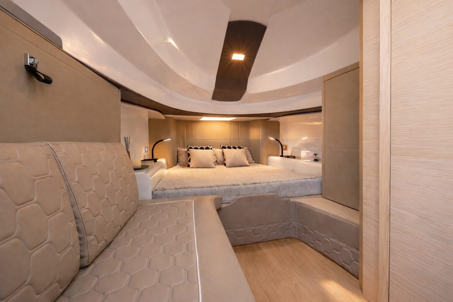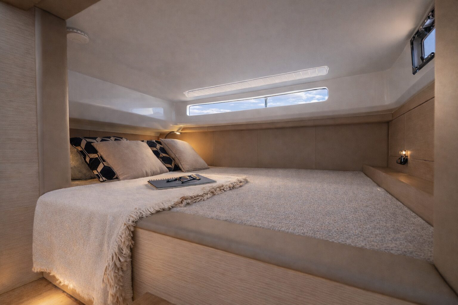 Below deck, the yacht offers well-appointed accommodation for up to four guests across two cabins. The interior is modern and refined, with clean lines, quality materials, and a functional layout that maximizes comfort for overnight stays.