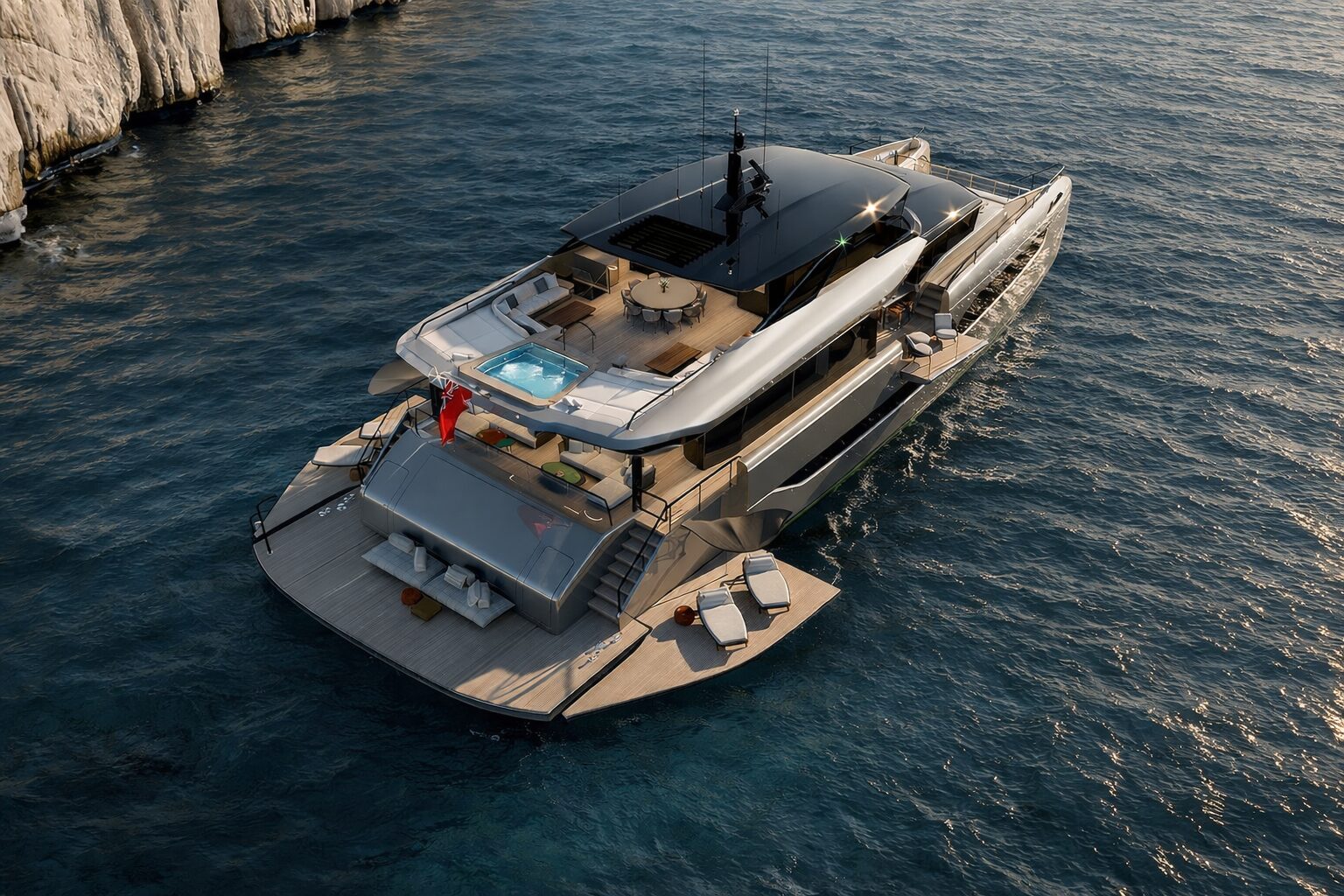 Outdoor living is elevated through fold-out bulwarks that transform the aft deck into a spacious lounge area. A semi-open dining space invites alfresco enjoyment, and an integrated swim platform provides direct access to the sea and water toys.