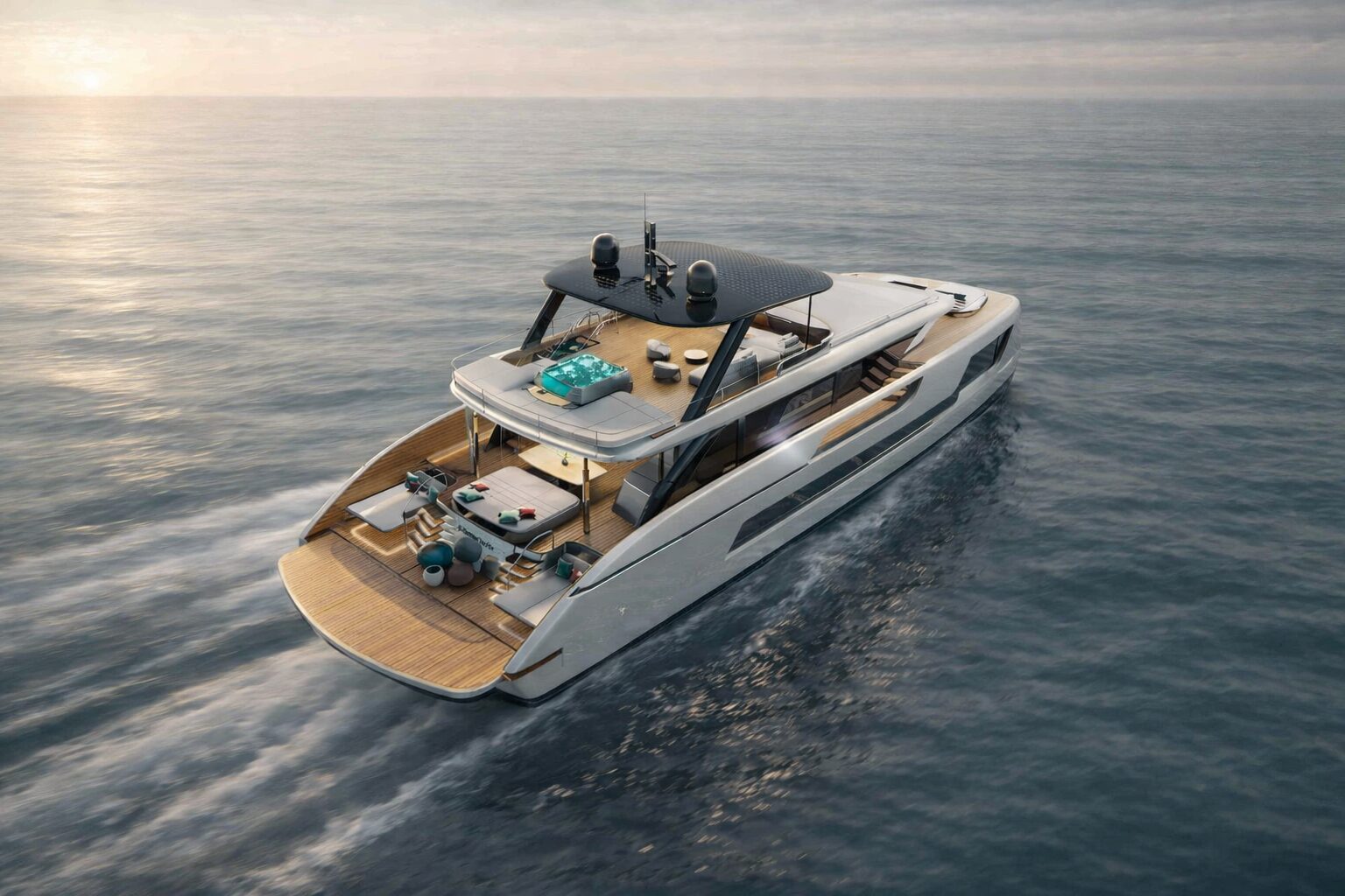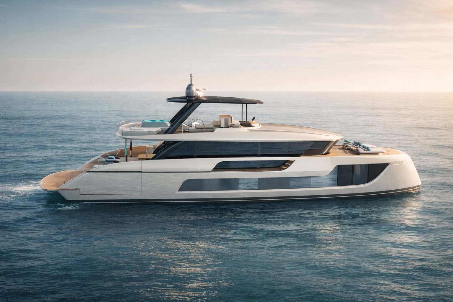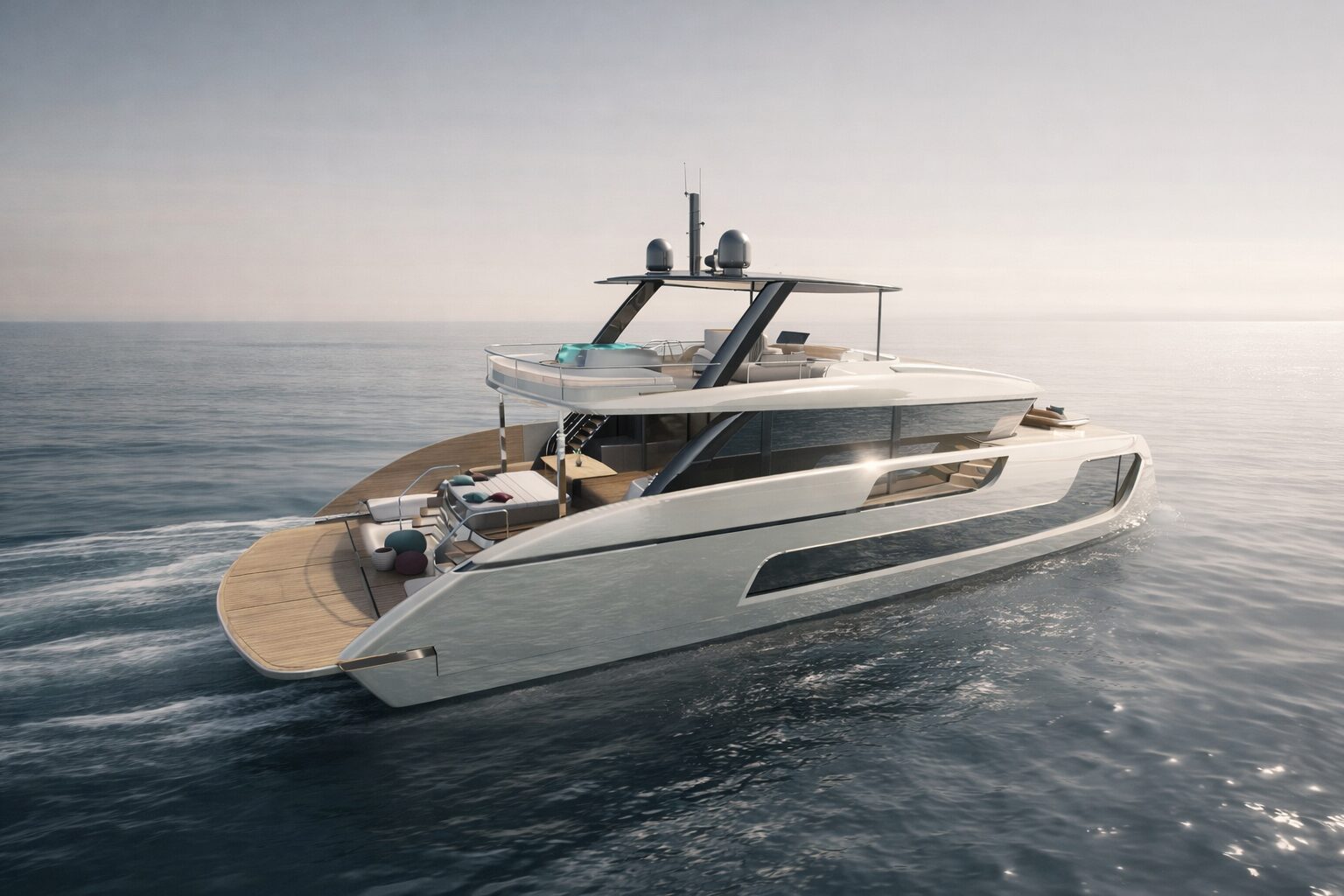 On board, the experience is one of contemporary elegance and intelligent design. Expansive glazing invites natural light to flood the interiors, while seamless indoor-outdoor transitions create a fluid connection with the sea. Each yacht is bespoke, allowing owners to shape the layout, finishes and atmosphere to reflect their personal vision.