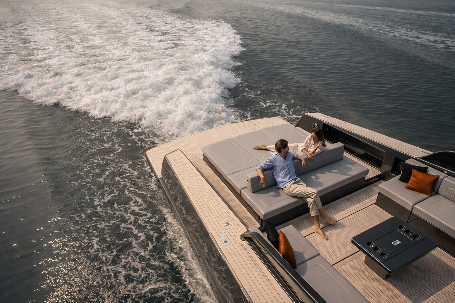 Performance is equally assured. Twin high-powered engines deliver exhilarating speeds of up to 38 knots, while her deep-V hull ensures a smooth, stable ride. Whether cruising at pace to a secluded anchorage or making a stylish entrance to a waterfront restaurant, the experience is seamless and composed.